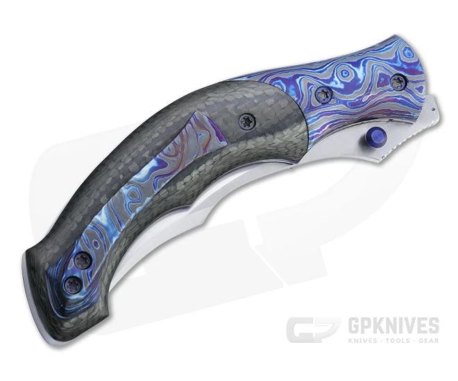 Handle: Thick anodized titanium liners support polished carbon fiber scales handle scales flush fit to black Timascus bolsters. The serpentine curves deliver a surprisingly comfortable handle with a solid grip, plenty of style, and a carry friendly package. The liner lock mechanism is smooth in operation and delivers secure lockup for safe use. Includes Dragoncut microfiber pouch and signed information card.