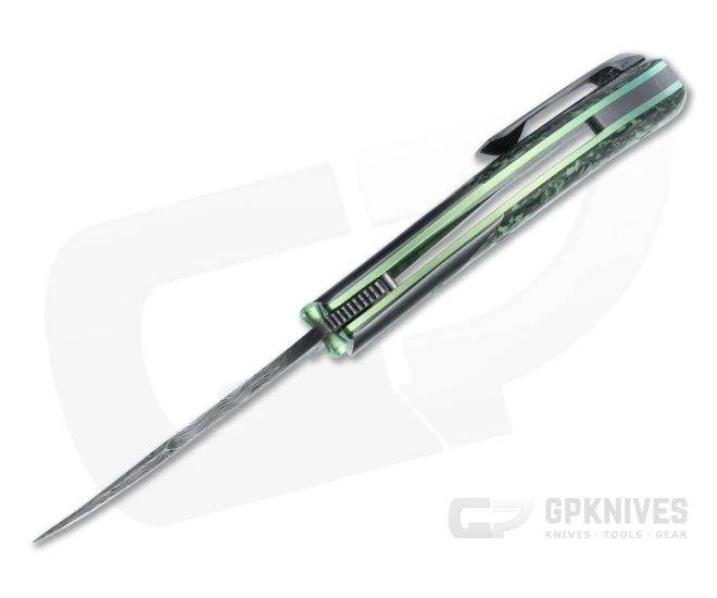 Handle: Thick anodized titanium liners support polished green shred carbon fiber scales handle scales flush fit to zirconium bolsters. The serpentine curves deliver a surprisingly comfortable handle with a solid grip, plenty of style, and a carry friendly package. The liner lock mechanism is smooth in operation and delivers secure lockup for safe use. Includes Dragoncut microfiber pouch and signed information card.