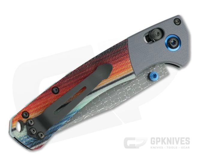 The Benchmade Mini Crooked River offers the same design as its big brother in an everyday carry platform. Now available in a Limited Edition Gold Class model, this Mini Crooked River offers the same great design with premium materials for dress carry style and collector appeal. This Mini Crooked River has a Chad Nichols “Lizard” pattern Damascus blade, gray G10 bolster and custom Mexican blanket G-Carta scales with additional custom details listed below. Limited to 200 pieces made.