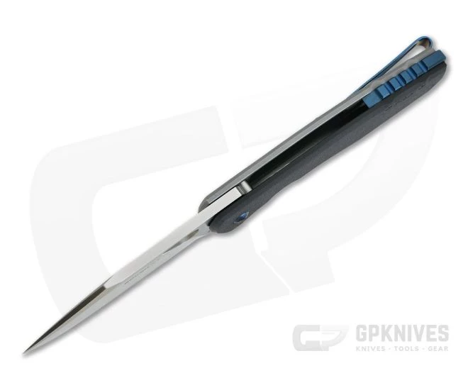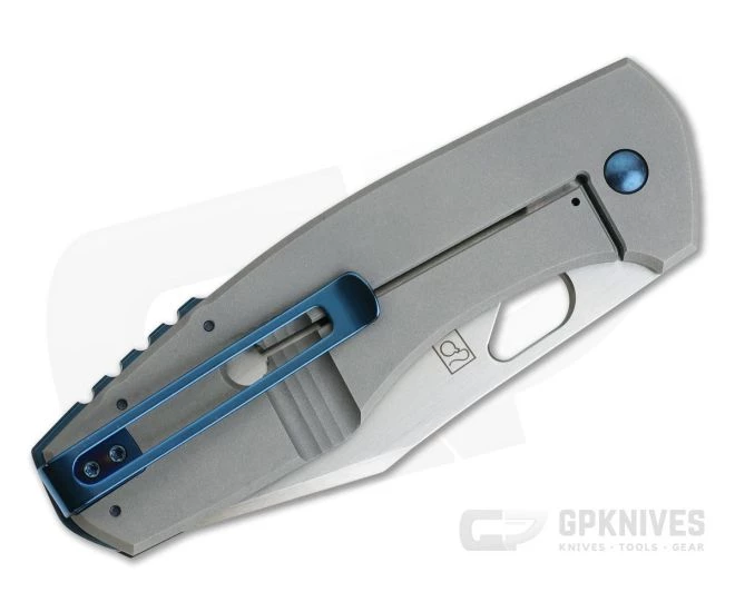 Handle: Elegant and simple, the handle has three main components: a coarse black G10 front scale, a blasted gray stainless steel frame lock on the back and a jimped and blue PVD coated, stainless steel partial back spacer bringing them together with matching blue PVD Torx hardware. Plenty of space is provided for even the largest hands to have a secure grip while the frame lock delivers smooth, solid and reliable lockup with scallops for easy disengagement. Includes a lockable zippered nylon pouch for transport and storage.