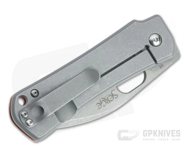 Handle:Â A satin finished raw copper pairs with the stainless steel frame and open construction barrel spacers to form a robust, comfortable handle. Raw copper with develop a unique natural patina over time with carry and use. The Serge Panchenko logo is milled into the front scales, along with groove milling that adds traction and visual appeal. The steel frame lock construction is tough yet smooth to operate, while interior milling on both scales reduces the overall weight. A generous hole is provided for lanyard attachment.