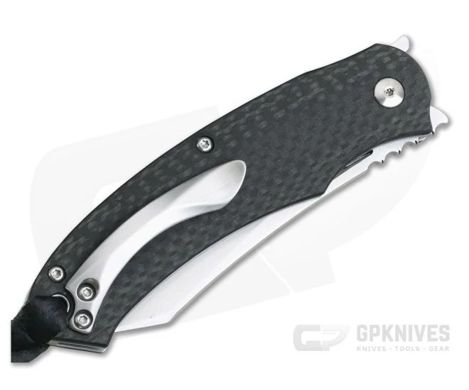 Handle: Solid stainless steel liners support modern, Carbon Fiber handle scales for an elegant yet functional platform. A nearly full length stainless steel back spacer adds heft in the hand and protects the blade during carry. The liner lock mechanism is smooth, secure and reliable in use. A hollow tube is provided for lanyard attachment.