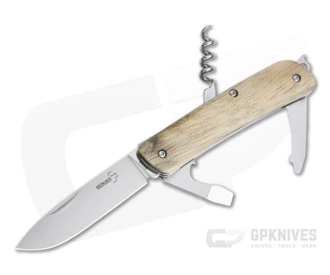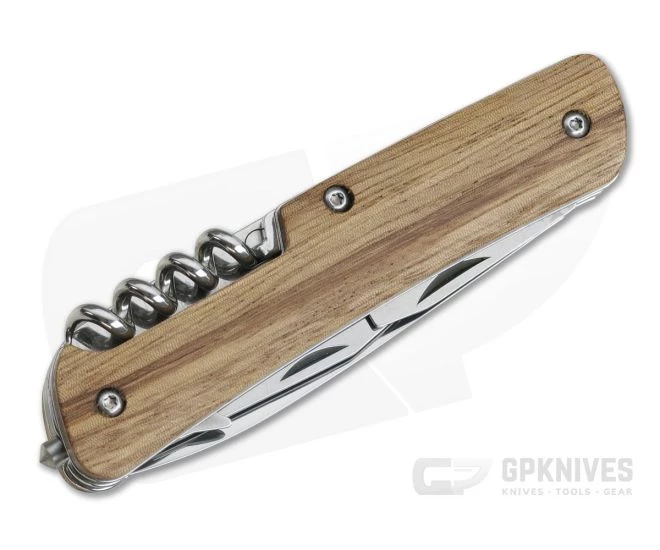 Blade:Â Composed of 12C27 Sandvik stainless steel, the single drop point blade has been mirror polished and features a nail nick for opening. Operating on a traditional slip joint, the knife has a non-aggressive opening function allowing it to fit right into an office or urban setting. Additional tools include: corkscrew, folding lanyard hole, small serrated blade/flat-head screwdriver, bottle opener/large flat-head/wire stripper/wire bender.