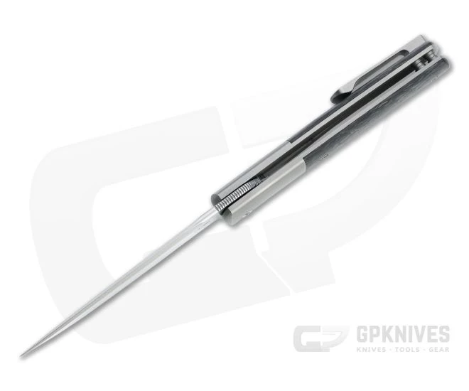 Handle:Â Blasted titanium liners with integral bolsters support striking “wild” shred carbon fiber scales for a beautiful and comfortable handle that offers a full grip and carries like a dream. Dual barrel spacers join the handles in an easy to maintain open back construction while the hardened steel lock face equipped titanium frame lock provides smooth operation and rock solid lockup for safe use. Includes padded zipper pouch for storage.