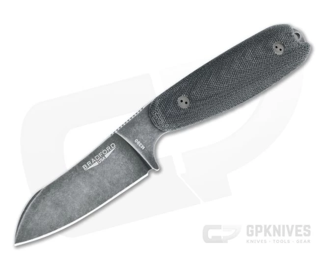 The Guardian3.5 fixed blade from Bradford Knives hits the sweet spot in size with a larger handle and blade than the popular Guardian3 while still being compact for daily carry and use. A great companion or replacement for an EDC folder, the G3.5 has an integral guard and strategic jimping for safe use, while the neutral handle design is comfortable in multiple grip positions. This Sheepsfoot variant has a stonewashed black DLC ‘Nimbus’ finished M390 blade and 3D black canvas Micarta scales.