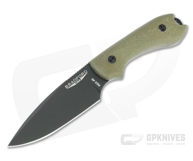 The Bradford Guardian3 is a compact, American made, everyday carry fixed blade that makes a perfect belt-carry companion for urban or outdoor use. Built to replace the modern EDC folding knife, the Guardian3 has a compact size that is easy to carry while still providing plenty of edge for your cutting needs. This GPKnives Exclusive has a false edge blade of black DLC coated CPM Rex 45 tool steel and 3D contoured OD Green canvas Micarta handle scales.
