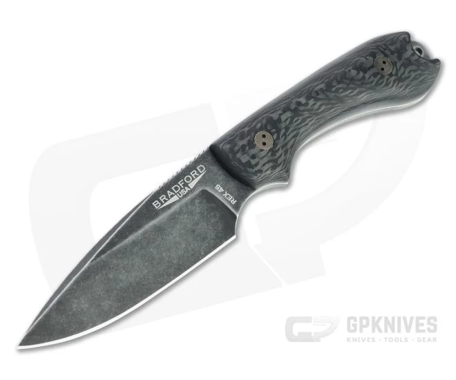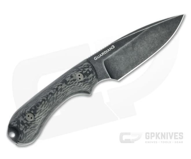 The Bradford Guardian3 is a compact, American made, everyday carry fixed blade that makes a perfect belt-carry companion for urban or outdoor use. Built to replace the modern EDC folding knife, the Guardian3 has a compact size that is easy to carry while still providing plenty of edge for your cutting needs. This GPKnives Exclusive has a false edge blade of Nimbus finished CPM Rex 45 tool steel and 3D contoured carbon fiber handle scales.