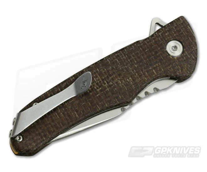 Handle:Â Full stainless steel liners create the foundation while contoured Brown Burlap Micarta scales make for a comfortable, secure grip with a tough look and feel. The generous handles should fit easily into most small to medium sized hands. The hardy liner locking mechanism in the handle is easy to use and provides secure lockup.