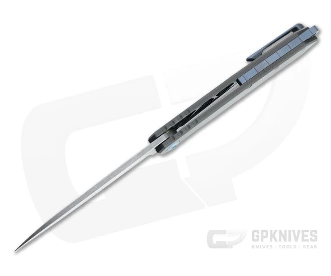 Handle: Blasted matte dark gray titanium slabs are internally milled for weight reduction forming a slim yet substantial handle. The ergonomic design is enhanced by chamfered edges for comfort with a deep index choil and jimping near the pivot. The integral frame lock comes with a hardened steel lock face for smooth operation, solid lockup and secure operation for the life of the knife. Custom blue anodized hardware, back spacer and clip add a pop of color. Ships in a zippered nylon pouch with Certificate of Authenticity.
