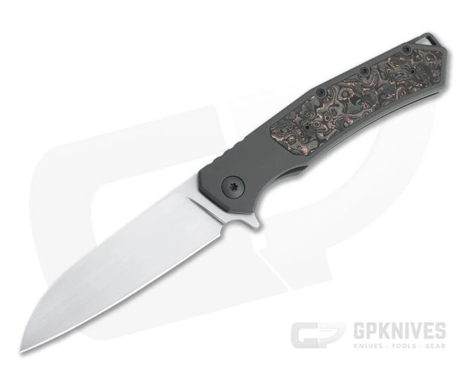 Handle: Blasted matte dark gray titanium slabs are internally milled for weight reduction forming a slim yet substantial handle. The ergonomic design is enhanced by chamfered edges for comfort with a deep index choil and jimping near the pivot. The integral frame lock comes with a hardened steel lock face for smooth operation, solid lockup and secure operation for the life of the knife. Custom copper Carbon Plate carbon fiber inlays are stunning and further reduce the carry weight. Ships in a zippered nylon pouch with Certificate of Authenticity.