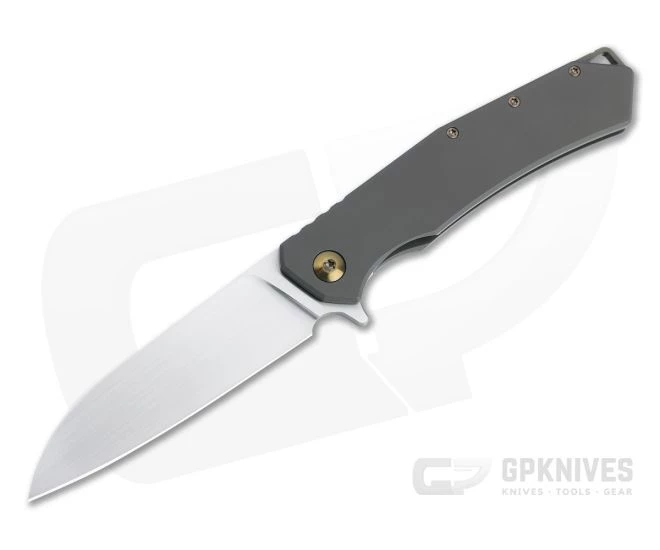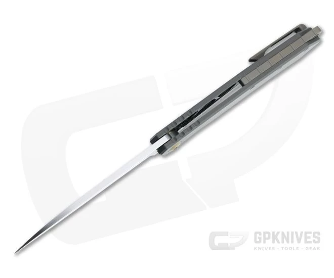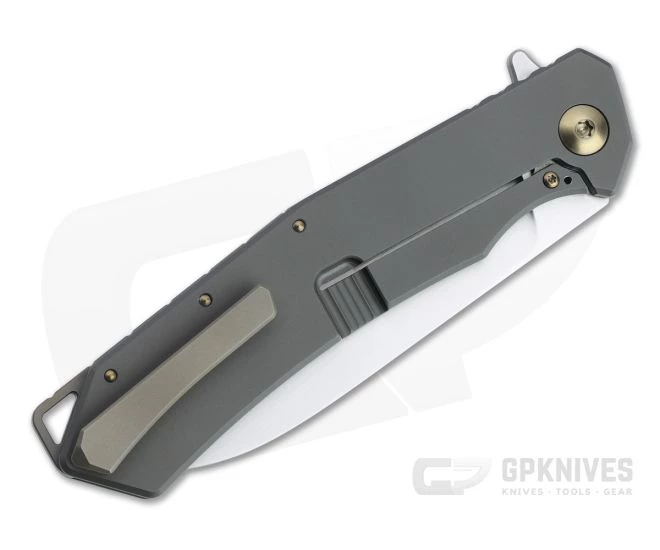 Handle: Blasted matte dark gray titanium slabs are internally milled for weight reduction forming a slim yet substantial handle. The ergonomic design is enhanced by chamfered edges for comfort with a deep index choil and jimping near the pivot. The integral frame lock comes with a hardened steel lock face for smooth operation, solid lockup and secure operation for the life of the knife. Custom gold anodized hardware, back spacer and clip add a pop of color. Ships in a zippered nylon pouch with Certificate of Authenticity.