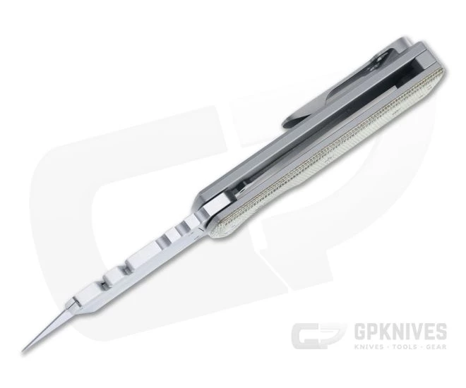Handle:Â Blasted and tumbled titanium forms the handle frame, liner, back spacer and clip. The simple, straight design works in multiple grips with enhanced ergonomics from the chamfered edges. The front canvas Micarta scale offers enhanced traction and improved tactile feel. The integral frame lock is smooth and solid thanks to the hardened steel lock face insert.