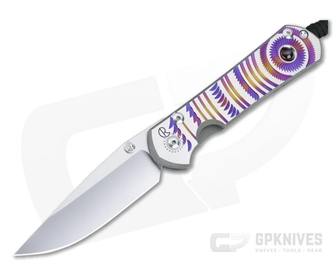 Handle: Matte gray blasted 6AL4V titanium handle slabs have a subtle texture and develop a unique patina with time and carry contrasting the fine satin front which serves as the canvas for a unique milled and anodized custom graphic. Each custom graphic is unique, and this one is complimented with a stunning Almandine (garnet family) inlay making this a fine piece for users and collectors alike. The Ceramic Ball Interface equipped Reeve Integral Lock provides “bank vault” lockup with increased reliability and lock life. Includes a tube of fluorinated grease, microfiber cloth, leather slip pouch, and information packet.