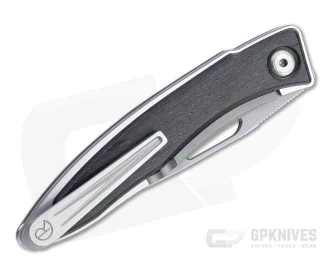 Handle: Wood inlays are set into the satin flats of the titanium handle while the edges and lock bar are ultra-fine glass bead blasted matte gray for a contrast in look and feel. Stabilized Bog Oak is rare wood in the beginning stages of fossilization. Buried and preserved in a peat bog for hundreds or sometimes thousands of years, Bog Oak’s hues are deep brown to almost black wood. The Reeve Integral Frame Lock delivers smooth operation and rock solid lock up for secure use. Includes a leather slip pouch, fluorinated grease tube, Chris Reeve microfiber cloth, single Allen key and information packet.