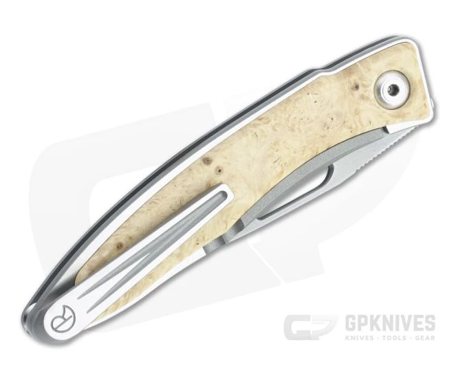 Handle:Â Wood inlays are set into the satin flats of the titanium handle while the edges and lock bar are ultra-fine glass bead blasted matte gray for a contrast in look and feel. Stabilized Box Elder burl wood delivers a stunning look with unique burl figuring in warm, yellow-gold tones. The Reeve Integral Frame Lock delivers smooth operation and rock solid lock up for secure use. Includes a leather slip pouch, fluorinated grease tube, Chris Reeve microfiber cloth, single Allen key and information packet.