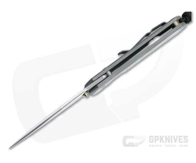 Handle: Matte gray blasted 6AL4V titanium handle slabs have a subtle texture and develop a unique patina with time and carry. Blasted titanium contrasts the fine satin front which serves as the canvas for a unique milled and anodized custom graphic. Each custom graphic is unique making this a fine piece for users and collectors alike. A smaller size offers a full grip and compact daily carry while the Ceramic Ball Interface equipped Reeve Integral Lock provides “bank vault” lockup with increased reliability and lock life. Includes a tube of fluorinated grease, microfiber cloth, leather slip pouch, and information packet.