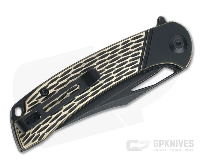 Handle: Skeletonized stainless steel liners support the hefty and ergonomic contoured Brass handle scales which have been milled with a faux bolster and jigged texture for a timeless look and enhanced traction in hand. The scales have been given a black oxide patina and then strategically polished to bring out the jigged texture and bolstered look. One liner forms the liner lock mechanism offering smooth, reliable operation and solid lockup with scallops to aid in disengagement. Exposed liners at the pommel are milled with a generous hole for lanyard attachment while a partial G10 back spacer and black Torx hardware complete the construction.