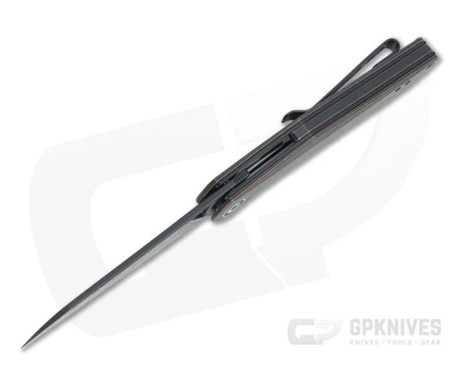 Blade: A fully flat ground, hand rubbed black, Chinese Damascus (9Cr18MoV stainless base steel with HRC near 60) blade rides on a caged ceramic ball bearing pivot for ultra smooth, fast deployment via the minimalist top flipper tab that is fully hidden in the open position. The modified Sheepsfoot blade is slim yet robust with a full length sweeping belly for slicing performance. A subtle choil allows for full sharpening and added control in fine tasks. The hand rubbed black finish delivers a more subdued look and a rounded triangle blade hole lends to Isham’s signature style. Like many of Isham’s designs the Mckenna has a negative blade angle that is more ergonomic and efficient for general cutting tasks.