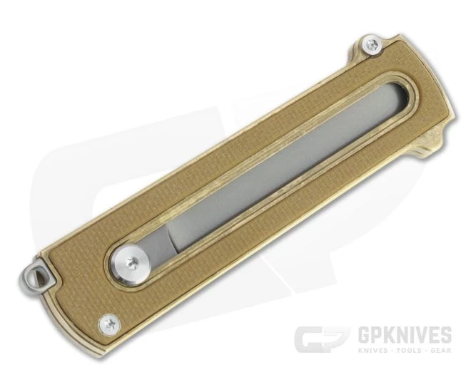 Handle: Dual slabs of G10 inlaid aluminum bronze house the blade and button lock which ride in the centrally milled channels with secure full stops open and closed. The raw aluminum bronze alloy will naturally patina over time, though slower than standard bronze. The G10 inlays reduce weight while providing solid traction in use. Dual guards provide added safety and a titanium extension allows for lanyard attachment or keychain carry.