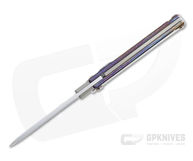 Handle: Two slabs of striking Alien Camo Timascus form the streamlined handle delivering good heft and exceptional visual appeal. Inside are two steel liners, one is the lock, the other attaches to the button. The combination provides a safe, secure and easy to operate locking mechanism. A milled hole at the back allows for lanyard attachment with silver hardware and back spacer completing the construction.