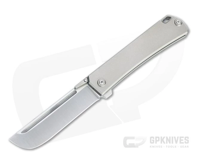 Redesign the traditional Sodbuster with modern materials and space age look, and you might end up with something like the D Rocket Jupiter EDC. The solid skinner blade rides smooth on bearings with two large thumb studs for deployment. Dual slabs of chamfered titanium house the blade, back spacer and well-engineered button operated liner lock. When depressed, the button prevents the blade from fully closing for an added measure of safety. This version comes with a satin finished M390 blade and blasted titanium handle.
