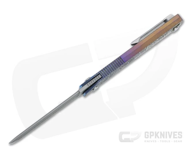 The D Rocket Design MaximX is the larger version of a potential SpaceX company knife design, the MinimalX. It retains the matte gray finish, eye-catching 6 face blade grinds and deep fullers that make this such a visual stand out. A high speed bearing driven inline flipper, the MaximX carries slim while delivering the performance and capabilities of a full size blade. This version features a solid Ti framelock handle and engraved Aztec calendar graphics with multicolor anodization. Marked #032/100