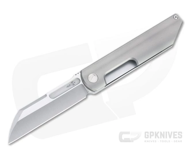 The D Rocket Design Revenge is a slim front flipper that disappears in the pocket for discreet carry while being fast to deploy thanks to the bearing pivot and streamlined flipper tab. The blasted titanium handle is lightweight, tough and contoured for comfort, housing the aggressive modified Wharncliffe blade and inset steel liner lock. The Revenge “Fukushu” is a modern gentleman’s tactical folder perfect for daily carry. This version comes with a matte gray handle and satin finished M390 blade.