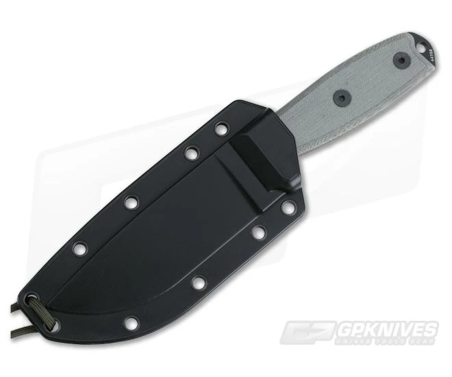 ESEE 4 with a plain edge and black traction coated 1095 tool steel blade. This original ESEE 4 has a full tang with red colored liners separating the black linen micarta handle scales from the tang. Along the spine of the blade, where the thumb rests, jimping has been added to provide an improved grip. Each knife has been individually serialized on the rounded pommel. Includes a molded black sheath, bolt-on belt clip plate, paracord and a cord lock. The knife snaps tightly into it’s sheath allowing for inverted carry. The ESEE 4 is a bit longer and wider than the 3, making it the perfect backpacking and survival knife. A survival business card and instruction sheet has been packaged with the knife and helps to explain the many carry options of the knife.