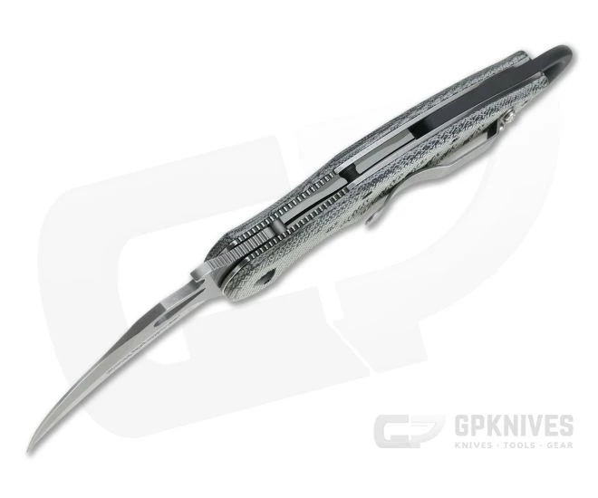 Handle: Constructed using full-length, skeletonized stainless steel liners the ergonomic scales are chamfered for comfort with finger grooves and thumb scoop for a solid grip. One liner forms the smooth, reliable and rock solid locking mechanism. A partial back spacer extends past the end of the handle to form a solid finger ring ensuring a place for every finger with any grip. This version has canvas Micarta scales which are rugged and durable offering traction even when wet and a warm in hand feel. Construction is rounded out with all black hardware.