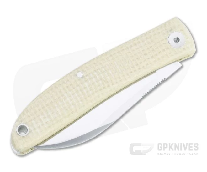 Handle:Â Minimalist and elegant, the streamlined handle is made from linerless burlap Micarta for a classically rugged yet stylish look and warm feel in the hand. Satin stainless steel hardware attaches the handles to the matching back spring which offers smooth, slip joint operation with a solid half stop for security. Includes Italian leather slip for carry.