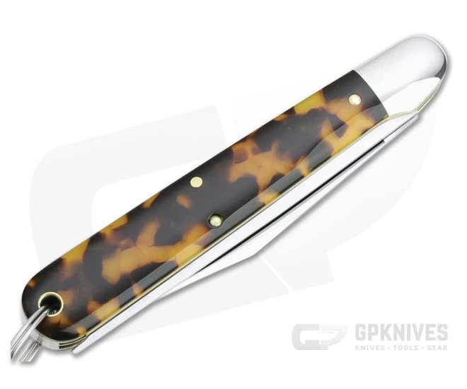 Handle: Fit perfectly to polished nickel silver bolsters are eye-catching tortoise shell acrylic covers, delivering a generous handle with a gentle taper toward the blade and subtle index guard. Construction is classic brass liner and pin with strong stainless steel back springs for secure slip joint operation. A steel split ring with signal whistle comes attached. Each GEC knife ships in a sturdy tube with company information on the front.