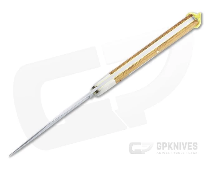 Handle: Fit perfectly to brushed nickel silver bolsters are handsome Osage orange wood covers, delivering a generous handle with a gentle taper toward the blade and subtle index guard. Construction is classic brass liner and pin with a strong stainless steel back spring for secure slip joint operation. A nylon lanyard with acorn bead comes attached. Each GEC knife ships in a sturdy tube with company information on the front.