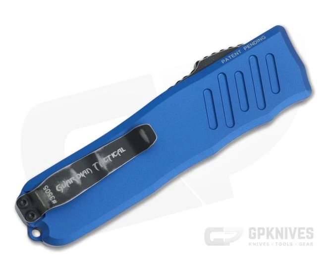 The Recon-035 is a modern and innovative, double action, out the front automatic that is perfect for everyday carry. With patented steel thumb slide base and floating blade construction the Recon-035 is smooth and reliable in its operation while having minimal play and a rock solid feel. This version comes with a partially serrated black stonewashed Tanto Elmax blade and Blue handle with all black hardware.