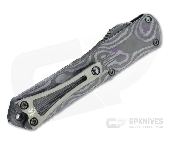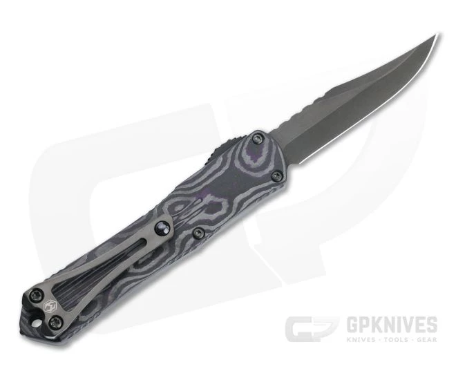 The Heretic Knives Manticore-S is the smallest of the Manticore Series of double action, out the front, automatic knives. The scaled down Manticore-S has the same contoured aircraft grade aluminum handle with traction scallops and fluting for a stylish look, secure grip and compact carry. This Bowie version comes with a stonewashed black DLC coated Elmax blade, black frame and black and purple camo (marbled) carbon fiber back cover.