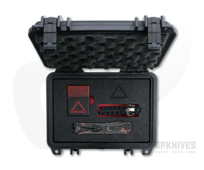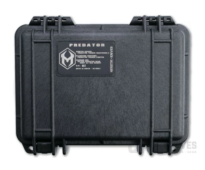 The Manticore-E is a mid-size, double action, out-the-front automatic built for daily carry. This highly limited custom set is Predator themed with the Manticore-E in two-tone Battleworn DLC and red camo carbon fiber paired with a Harding custom silver and garnet Predator bead lanyard, Blackside Customs themed lighter and custom 1120 Pelican hard case. S/N 007.