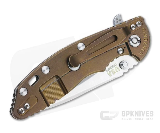 Handle: Titanium frame and liner come in a matching bronze stonewashed finish that hides wear with style while the textured G10 scale and jimping provide a secure grip. Equipped with a steel lock face insert, the integral frame lock has solid lockup and smooth operation for safe use. The Hinderer LockBar Stabilizer, titanium clip insert and hardware make this a fully customizable modular design.