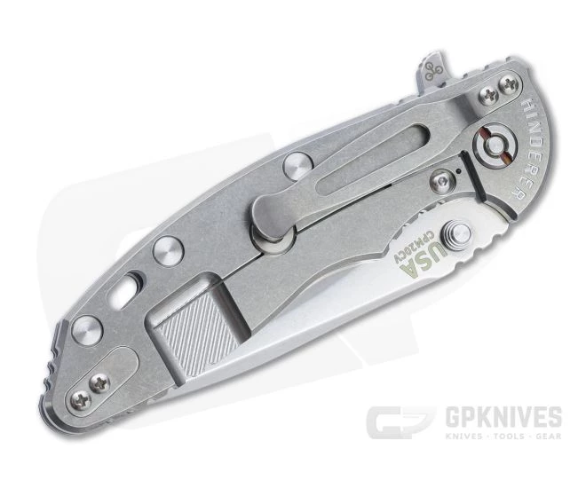 Handle: Titanium frame and liner come in a matching stonewashed finish that hides wear with style while the textured G10 scale and jimping provide a secure grip. Equipped with a steel lock face insert, the integral frame lock has solid lockup and smooth operation for safe use. The Hinderer LockBar Stabilizer, titanium clip insert and hardware make this a fully customizable modular design.