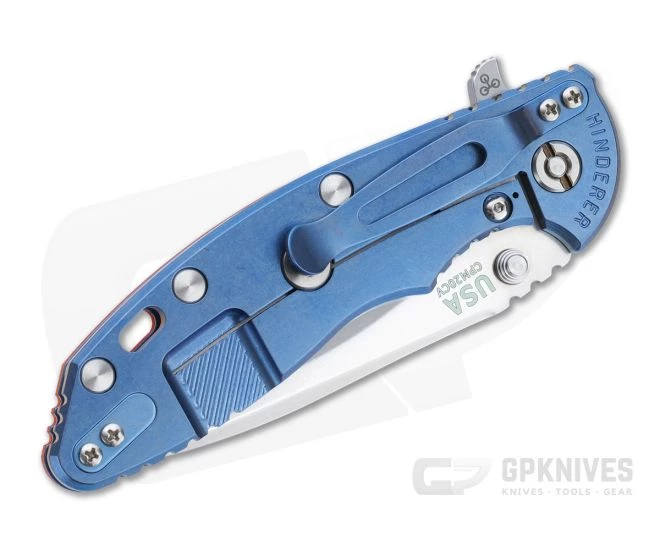 Handle: Titanium frame and liner come in a matching blue stonewashed finish that hides wear with style while the textured G10 scale and jimping provide a secure grip. Equipped with a steel lock face insert, the integral frame lock has solid lockup and smooth operation for safe use. The Hinderer LockBar Stabilizer, titanium clip insert and hardware make this a fully customizable modular design.