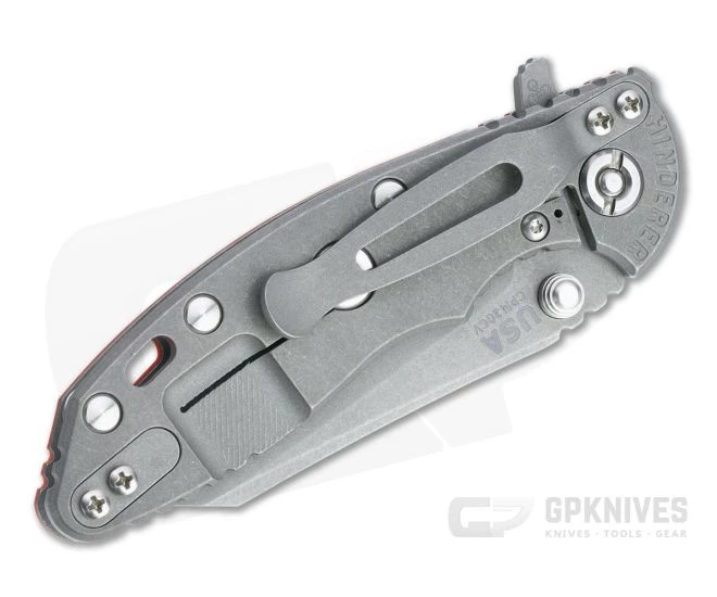 Handle:Â Titanium frame and liner come in a matching low-profile Working Finish that hides wear while the textured G10 scale and jimping provide a secure grip. Equipped with a steel lock face insert, the integral frame lock has solid lockup and smooth operation for safe use. The Hinderer LockBar Stabilizer, titanium clip insert and hardware make this a fully customizable modular design.