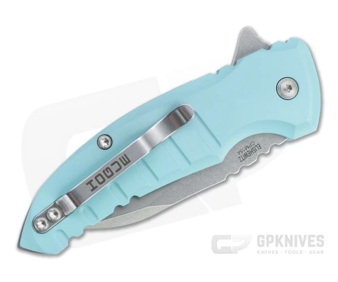 Handle: Slabs of hard anodized 6061-T6 aluminum joined by a solid back spacer form the rock solid compact handle in eye-catching aquamarine. Jimping and milled grooves provide plenty of traction with a deep index choil for control and security. Backed by a slide safety the button lock delivers reliable lockup for safe use and smooth operation. The pommel end is tapered for impact use while the spacer, filler tab, and clip are finished to match the blade.