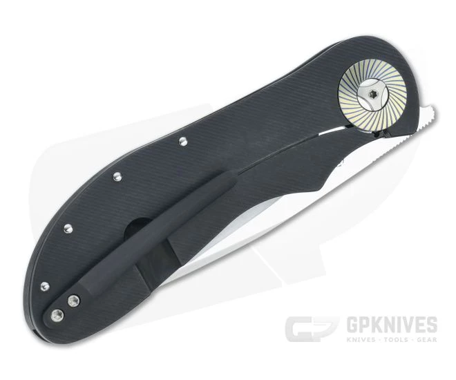 Handle: Made from texture milled titanium, the handles are simple, ergonomic and equipped with a dark matte finish. The rear frame forms an integral frame lock for safe use. Turbo cut milled and anodized pivot collars provide a striking visual element. Ships in a zippered nylon pouch with Certificate of Authenticity.