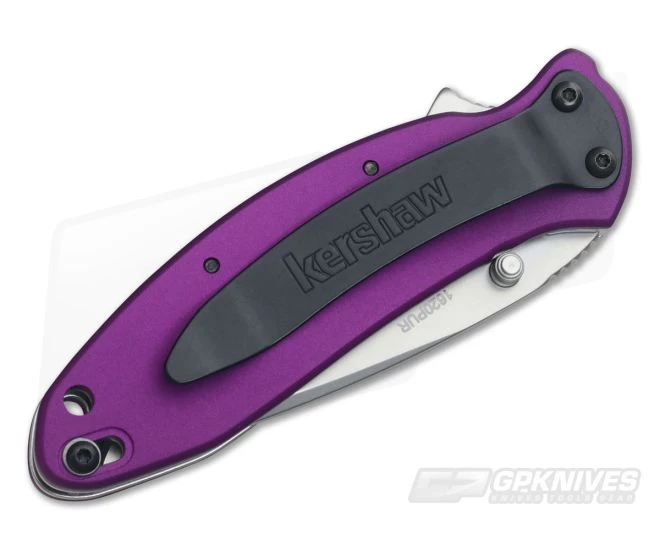 This Kershaw Scallion features a Bead-Blasted 420HC stainless steel blade and deep jewel tone Purple anodized 6061-T6 aluminum handle. Dual thumb studs and flipper for easy opening. SpeedSafe assisted opening with liner lock and safety tip lock. Stainless steel tip-down pocket clip. Brand new direct from Kershaw Knives.