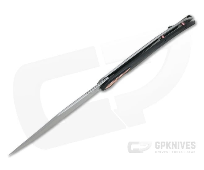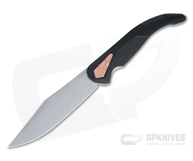 Handle: Copper anodized barrel spacers join the stainless steel frame lock and black G10 front scale with matching copper anodized pivot cap in a rock solid construction that is surprisingly light for its size. Slim and sweeping in design, the handle is ergonomic for comfort during extend use while being streamlined in the pocket. The frame lock is smooth, reliable and easy to operate for safe use. A copper anodized inlay on the back serves as a stylish over travel stop.