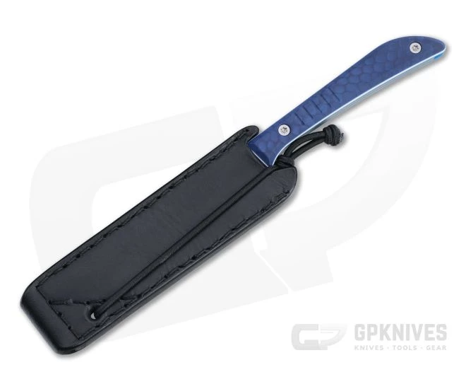Austrian Raimund Lhotak takes his trained precision as a typographer and designer and delivers it in his precision made custom knives, hand-built without the use of a cnc. Combining simple, utilitarian designs with premium materials, his modern folding and fixed blade knives are exceptional tools for daily carry and use in any environment. This RL5 Scrap Knife fixed blade comes with a bead blasted ATI 425 titanium alloy blade, blue snake Juma handle scales with blue and white liners, titanium hardware and leather sheath.