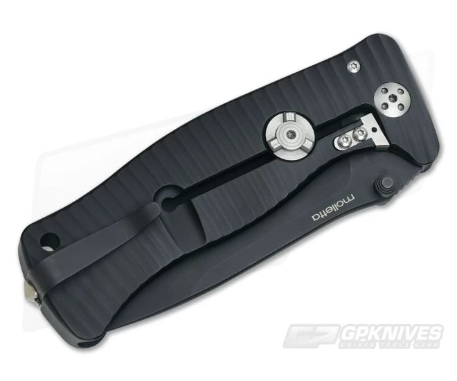 The Molletta designed LionSteel SR-1 Black Aluminum is the full size version of the innovative SR line of integral folders. The handle is milled from a single piece of ERGAL (Extra Refined Grain Aluminum) aluminum alloy and given a Black MilSpec finish. The frame lock includes LionSteel’s patented RotoBlock safety system. A simple turn of the RotoBlock stabilizer locks the blade open converting the folder into a fixed blade knife. Stainless steel lock bar insert engages the blade for a solid lockup and is replaceable if needed due to wear. The blackout finish onto the blade that’s ground from D2 tool steel. Includes a reversible tip-up deep carry pocket clip attached with a pointed screw that doubles as a glass breaker. Specialized tool for adjusting the pivot/reversing the pocket clip is included. Direct from LionSteel Knives.