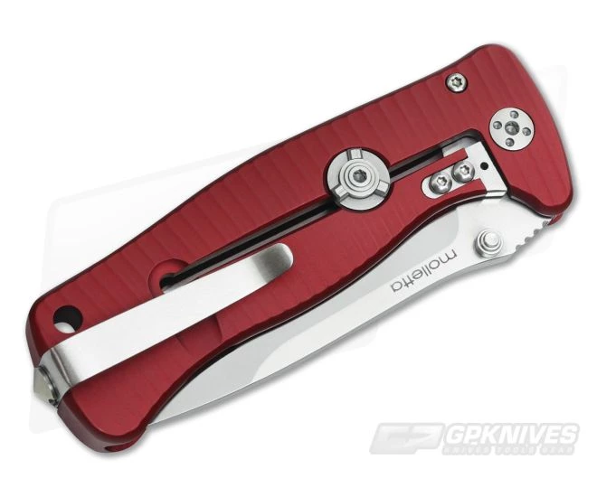 The Molletta designed LionSteel SR-2 Aluminum is the Mini version of the innovative SR-1 integral folder. The handle is milled from a single piece of ERGAL (Extra Refined Grain ALuminum) aluminum alloy and given a Red finish. The frame lock includes LionSteel\\\’s patented RotoBlock safety system. A simple turn of the RotoBlock stabilizer locks the blade open converting the folder into a fixed blade knife. A gorgeous satin finished blade is ground from pure Uddeholm Sleipner tool steel. Includes a tip-up deep carry pocket clip and a tool for adjusting the pivot/reversing the pocket clip. Direct from LionSteel Knives.