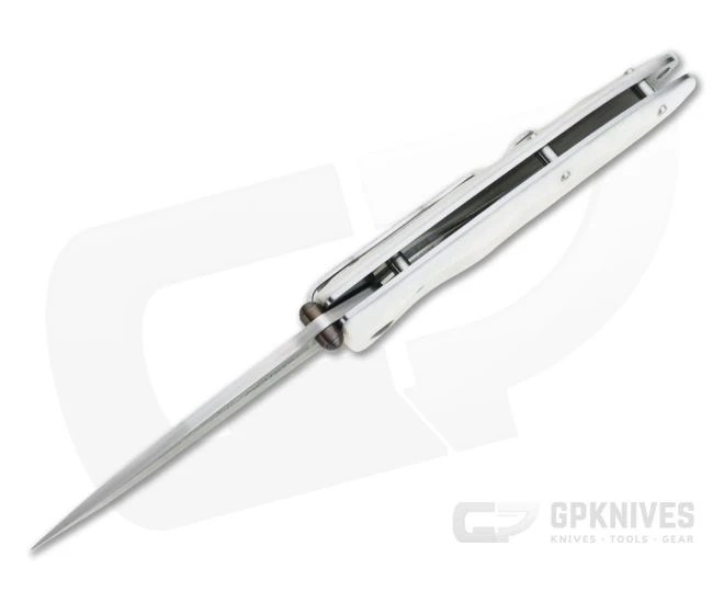 Handle:Â The exposed stainless steel liners are seamless and smooth creating the foundation for the satin finished Corian handle scales. Corian is a smooth, durable and stain resistant material often used in counter tops and makes a functional and striking handle material with the satin finish highlighting the unique texture of the material. The grooved milling of the “Classic Wave” scales provides added traction while the clean contours of the handle are ergonomic and comfortable. A liner lock mechanism provides reliable lockup and smooth operation.