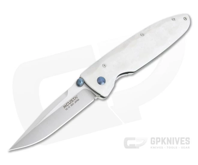 Blade: Made from VG10 stainless steel the utilitarian clip point blade of the MC-1 is equipped with a shallow hollow grind for excellent slicing performance and a nearly full length top swedge delivering piercing performance and a fine tip for detail work. The satin finished blade adds a classy look to this everyday carry folder. The blade opens smoothly on Teflon washers via dual thumb studs which match the satin pivot hardware.
