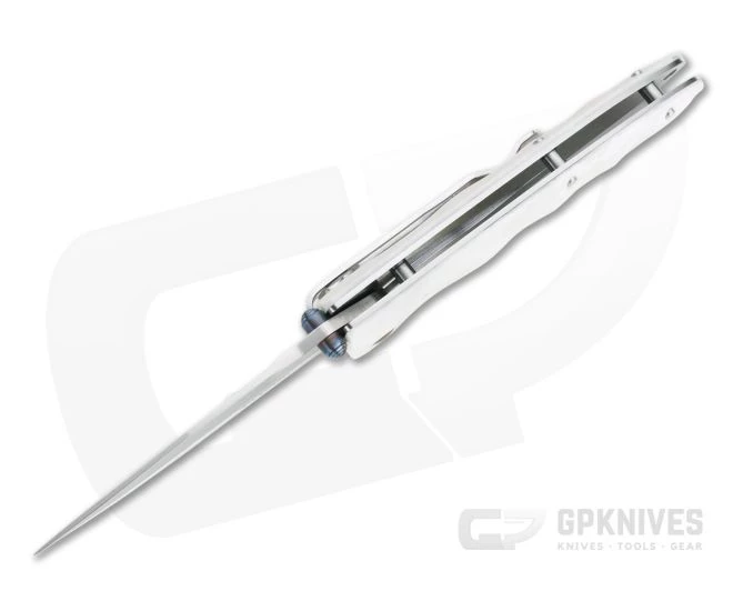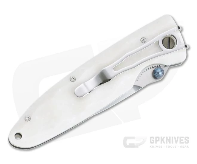 Handle: The exposed stainless steel liners are seamless and smooth creating the foundation for the satin finished Corian handle scales. Corian is a smooth, durable and stain resistant material often used in counter tops and makes a functional and striking handle material with the satin finish highlighting the unique texture of the material. The grooved milling of the “Classic Wave” scales provides added traction while the clean contours of the handle are ergonomic and comfortable. A liner lock mechanism provides reliable lockup and smooth operation.