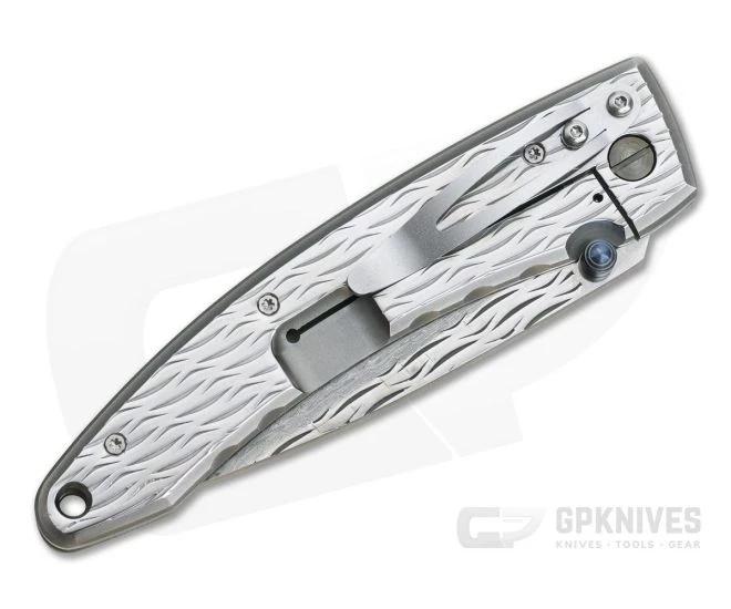 Handle:Â A robust, stainless steel frame construction is beautifully polished and then given a stylized wave textured finish for visual appeal and added traction. The integral frame lock mechanism is strong and secure with intuitive operation A generous hole at the pommel end is provided for lanyard attachment.